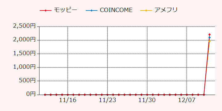 2025年12月11日に「放置ゲームゾンビ鉱夫【Android】」でもらえるポイントサイトの報酬最高額は、モッピー経由で2,210円です。その他、経由することでポイントを多くもらえるポイントサイトは、COINCOME、アメフリです。