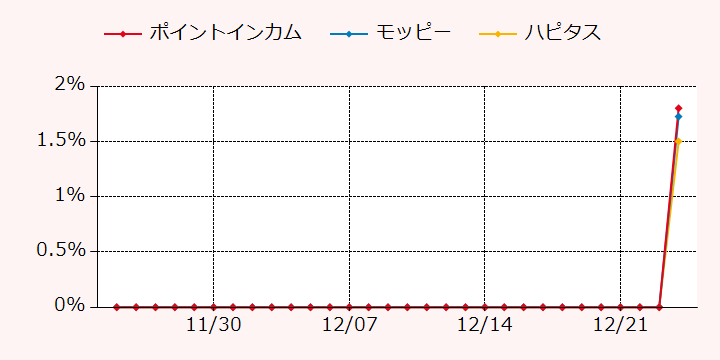 2025年12月24日に「Disneystore(ディズニーストア)」でもらえるポイントサイトの報酬最高額は、ポイントインカム経由で1.8%です。その他、経由することでポイントを多くもらえるポイントサイトは、モッピー、ハピタスです。